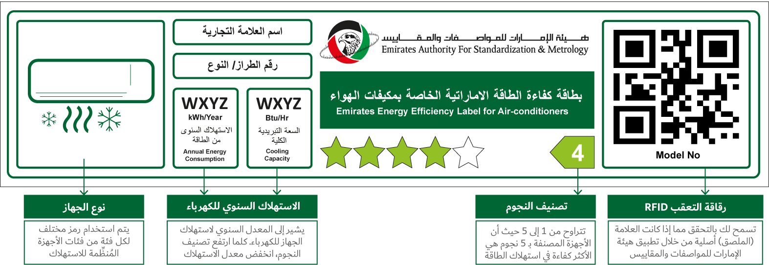 تساعد الأجهزة الموفرة للطاقة المستهلكين على تحقيق وفورات في فواتير الكهرباء والمياه من خلال تخفيض استخدام الطاقة دون المساس بمستوى الأداء أو الراحة. احرص على اختيار الأجهزة التي تحمل ملصق هيئة الإمارات للمواصفات والمقاييس من فئة 4 أو 5 نجوم، التي تساعد على ترشيد استهلاكك وحماية الموارد الطبيعية لنا ولأجيالنا القادمة.