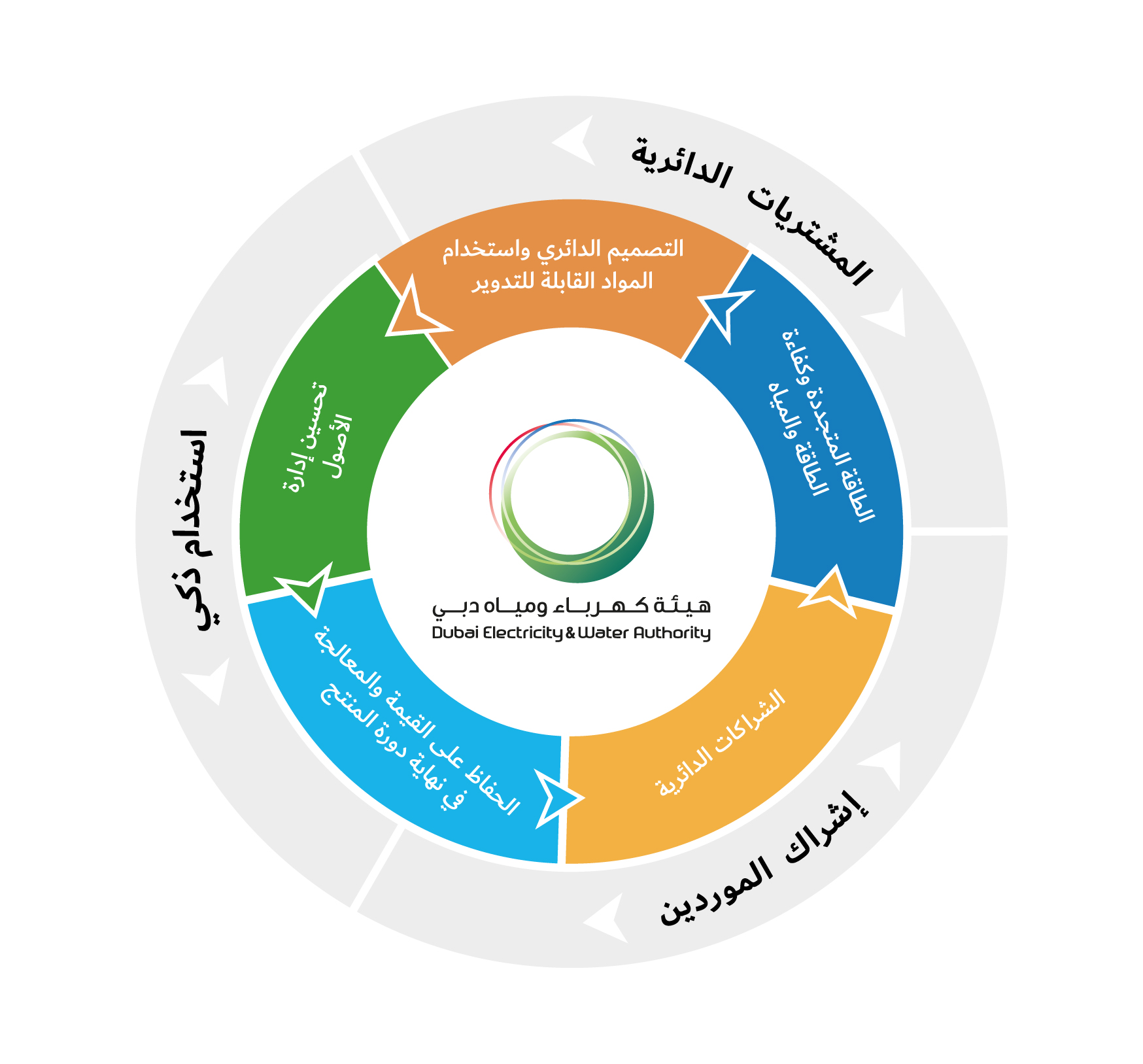 ينطوي نموذج الاقتصاد الدائري المعتمد لدى الهيئة على إعادة صياغة محددة، للمساهمة في تحقيق العديد من الاستراتيجيات والأهداف الموضوعة على المستوى العالمي والاتحادي والمحلي، ومن أبرزها أهداف الأمم المتحدة للتنمية المستدامة 2030 واستراتيجية الحياد الكربوني 2050 لإمارة دبي، وسياسة الاقتصاد الدائري لدولة الإمارات العربية المتحدة، واستراتيجية دبي للطاقة النظيفة 2050.
