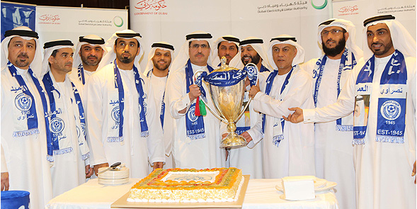 احتفالاً بفوزه بكأس رئيس الدولة لكرة القدم لعام 2015، استقبل سعادة سعيد محمد الطاير، العضو المنتدب الرئيس التنفيذي لهيئة كهرباء ومياه دبي، في مكتبه بالهيئة، سعادة /مروان بن غليطة رئيس مجلس إدارة نادي النصر الرياضي وشركة النصر لكرة القدم وأعضاء مجلس الإدارة ، عبدالله بوعميم، المدير التنفيذي، وحميد بن احمد الطاير، عضو مجلس الإدارة، مشرف الفريق الأول. وحضر الإحتفال سعادة أحمد بطي المحيربي، أمين عام مجلس الأعلى للطاقة في دبي والنواب التنفيذيين للرئيس، ونواب الرئيس وكبار الموظفين في هيئة كهرباء ومياه دبي. وبهذه المناسبة تقدم سعادة/ سعيد محمد الطاير بأسمى آيات التهنئة والتبريكات إلى سمو الشيخ حمدان بن راشد آل مكتوم نائب حاكم دبي وزير المالية رئيس نادي النصر الرياضي، وإلى سمو الشيخ أحمد بن سعيد آل مكتوم رئيس دائرة الطيران المدني بدبي الرئيس الأعلى لمجموعة طيران الإمارات نائب رئيس نادي النصر الرياضي، وإلى سمو الشيخ راشد بن حمدان بن راشد آل مكتوم رئيس شركة النصر لكرة القدم، وذلك بمناسبة فوز الفريق بكأس رئيس الدولة لكرة القدم لعام 2015. وأضاف: تماشياً مع توجيهات سيدي صاحب السمو الشيخ محمد بن راشد آل مكتوم- نائب رئيس الدولة – نائب رئيس مجلس الوزراء- حاكم دبي، رعاه الله ، في النهوض بالرياضة والرياضيين، تكرس الهيئة جانبا كبيرا من نشاطاتها لخدمة القضايا المجتمعية من القضايا الثقافية والرياضية وتسعى دائماً للتواصل مع المؤسسات الحكومية والقطاع الخاص وجمعيات النفع العام لبناء جسور التعاون مع كافة فئات المجتمع ، حيث ينطلق ذلك من إستراتيجية وتوجهات الهيئة الخاصة بالمسؤولية المجتمعية وتقوية المواهب الإبداعية والبدنية لدى الشباب للوصول بها إلى العالمية. وبعد تقديم التهاني والتبريكات إلى ادارة النادي ولاعبيه ومشجعيه على هذا الانجاز التاريخي، قام سعادة /سعيد محمد الطاير مع سعادة /مروان بن غليطة بقطع قالب الحلوى المعد لهذا الاحتفال والذي زيّنه شعار النادي، وتم التقاط الصور التذكارية مع الكأس.