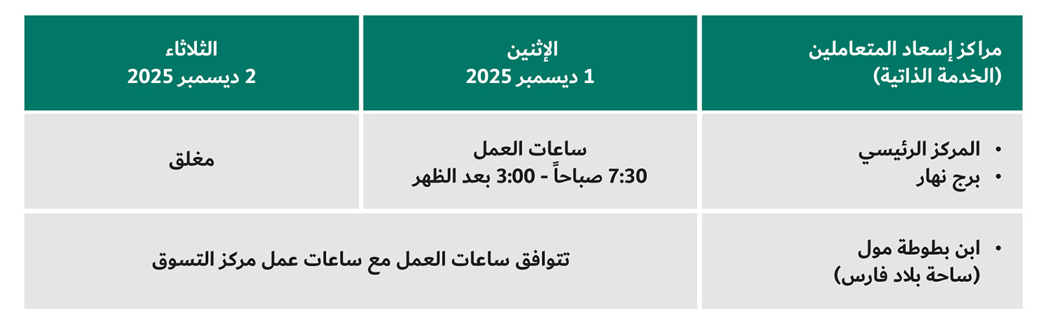 مراكز إسعاد المتعاملين (الخدمة الذاتية) | أوقات العمل | العنوان | رقم مكاني | إحداثيات الموقع | الموقع |