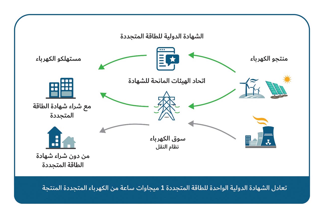 الشهادات الدولية للطاقة المتجددة (i-RECs) عبارة عن شهادات قابلة للتداول تمثل خصائص إنتاج الطاقة من مصادر الطاقة المتجددة، ويمكن بيع أو تداول هذه الشهادات بشكل منفصل عن الأنظمة المنتِجة للكهرباء. ويعد نظام (i-REC) إطاراً عالمياً للتتبع يسمح للمستخدمين النهائيين على مستوى العالم بطلب الحصول على أنواع محددة من الطاقة المتجددة وإظهار استهلاكهم للطاقة المتجددة بشكل موثوق. وتعد هذه الشهادات مفيدة بشكل خاص للشركات التي تستهدف الحصول على احتياجاتها من الطاقة من مصادر متجددة بنسبة 100%، وذلك للوفاء بمتطلبات الامتثال من خلال آليات التعويض عن انبعاثات الكربون.