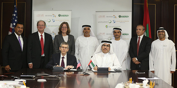 بعد النجاح منقطع النظير للمسابقة في اوروبا والصين وامريكا اللاتينية ودول الكاريبي، تتطلع وزارة الطاقة الامريكية إلى دعم جهود تنظيم المسابقة الجامعية لتصميم الأبنية التي تعتمد على الطاقة الشمسية في دبي تستضيف إمارة دبي المسابقة العالمية للجامعات لتصميم الأبنية الذكية التي تعتمد على الطاقة الشمسية (SOLAR DECATHLON )، وهي مسابقة دولية تنظم من قبل وزارة الطاقة في الولايات المتحدة، وتشارك فيها جامعات من جميع أنحاء العالم، تجتمع لتصميم وبناء وتشغيل بيوت تمتاز بكفاءة عالية في إستخدام الطاقة. وستنظم المسابقة للمرة الأولى في الشرق الأوسط في إمارة دبي، وذلك في إنجاز جديد يعكس المكانة العالمية المتميزة التي وصلت إليها دولة الإمارات العربية المتحدة، ويؤكد دورها الريادي في المنطقة. وقد اعربت وزارة الطاقة بالولايات المتحدة الامريكية عن سعادتها بالإعلان عن انضمام دبي إلى المسابقة التي سيتم تنظيم أولى دوراتها في الشرق الأوسط عام 2018 ودورتها الثانية عام 2020 في الإمارة تزامناً مع انعقاد معرض إكسبو دبي الدولي 2020. وقام كل من سعادة سعيد محمد الطاير، نائب رئيس المجلس الأعلى للطاقة في دبي والعضو المنتدب والرئيس التنفيذي لهيئة كهرباء ومياه دبي، وسعادة/ روبرت والر، القنصل العام للولايات المتحدة الامريكية في دبي، بالتوقيع على مذكرة تفاهم بتاريخ 17 يونيو 2015 لدعم جهود تطوير المسابقة كخطوة أولى للبدء في الإعداد لتنظيمها في دبي. وقد حضر مراسم التوقيع على الإتفاقية ، ريتشارد كينج، مدير المسابقة بوزارة الطاقة الأميركية، وجوديث بايكر، ملحق الشؤون السياسية والإقتصادية في القنصلية العامة للولايات المتحدة الأميركية في دبي، وناصر عباسي، ملحق الشؤون التجارية بالقنصلية الأمريكية في دبي، وديفيد دوردن، الملحق الإعلامي في سفارة الولايات المتحدة الأميركية في أبوظبي، وسعادة/ أحمد بطي المحيربي، أمين عام المجلس الأعلى للطاقة في دبي، والمهندس وليد سلمان، النائب التنفيذي للرئيس لقطاع الاستراتيجية وتطوير الأعمال بهيئة كهرباء ومياه دبي، والدكتور يوسف إبراهيم الأكرف، النائب التنفيذي للرئيس لقطاع دعم الأعمال والموارد البشرية في الهيئة، وخولة المهيري، نائب الرئيس لقطاع التسويق والاتصال المؤسسي في الهيئة، وعدداً من كبار المسؤولين بالمجلس الأعلى للطاقة والهيئة. وبهذه المناسبة أوضح سعادة /سعيد محمد الطاير : أن هذه الخطوة تأتي في سياق التزام الهيئة بوضع مبادرة سيدي صاحب السمو الشيخ محمد بن راشد آل مكتوم – نائب رئيس الدولة ، رئيس مجلس الوزراء ، حاكم دبي – رعاه الله – إقتصاد أخضر لتنمية مستدامة ، وخطة دبي 2021 ، موضع التنفيذ الفعلي، كما تشكل في نفس الوقت تطبيقاً عملياً لاستراتيجية دبي المتكاملة للطاقة 2030 التي تهدف لتنويع مصادر الطاقة ورفع مساهمة الطاقة المتجددة في مزيج الطاقة في دبي لتصل الى 15% بحلول عام 2030. وأضاف سعادته : يأتي هذا الإنجاز الجديد تعزيزاً لتنافسية الدولة، وفق رؤية الإمارات 2021 التي تهدف لأن تكون دولة الإمارات في مصاف أفضل الدول في العالم بحلول عام 2021، وجهود دبي في جعل الإبداع والإبتكار نهجاً مستقبلياً وتطوير مهارات الفئة الشبابية، واستمرارا لمسيرتها الخضراء التي جسدتها القمة العالمية للاقتصاد الأخضر التي نظمت في دبي، وسلطت الضوء على جهود والتزام الإمارة بتحقيق هدفها في أن تصبح عاصمة للاقتصاد الأخضر. حيث جاء مجمع محمد بن راشد آل مكتوم للطاقة الشمسية برهاناً ساطعاً على توجه دبي نحو الاقتصاد الأخضر من خلال رفع قدرته الانتاجية الى 3000 ميجاوات في العام 2030، وضمه لمراكز للبحوث والتطوير، لاختبارات الطاقة الشمسية، وللابتكار. وأوضح سعادته أنه : إنطلاقاً من استمرار سعي هيئة كهرباء ومياه دبي في بذل كافة الجهود من أجل حماية بيئـــتنا والمحافظة على مواردها من خلال مواكبة التحولات والتطورات العالمية في المجالات البيئية المختلفة لتحقيق الغايات البيئية المستهدفة لرؤية قيادتنا الرشيدة، وت