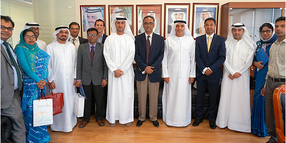 HE Ahmed Buti Al Muhairbi, Secretary General of the Dubai Supreme Council of Energy, received at the Council’s headquarters, a delegation from the People's Republic of Bangladesh, headed by HE Mohammad Muslim Chowdhury, Additional Secretary, Finance Division, Ministry of Finance. The meeting was attended by Nasser Al Shaiba, Director of Environment, Health, and Safety, Omar Al Qurashi, Senior Manager of Corporate Communications and General Services at the Supreme Council of Energy, and Jamal Alhammadi, Vice President of Special Projects at Dubai Electricity and Water Authority (DEWA). The delegation was briefed on the Supreme Council of Energy’s work, the Dubai Integrated Energy Strategy 2030, the Demand Side Management Strategy, and future development projects in Dubai. The Council gave an overview of Dubai’s achievements by implementing best practices in the partnership projects between the public and private sectors in renewable and clean energy. This has significantly contributed to achieving competitive low prices in the local market. The visitors also reviewed energy and environmental conservation campaigns, and the Council’s plans to establish Dubai as a role model for energy efficiency. At the end of the meeting, HE Chowdhury thanked the Dubai Supreme Council of Energy for the warm reception. The two sides exchanged gifts.